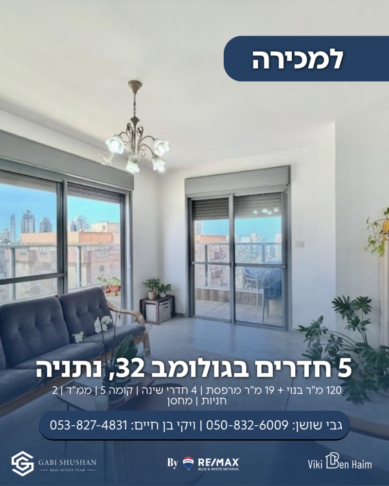 בניין מבוקש בצפון העיר רח' אליהו גולומב 32 דירת 5 חדרים 120 מ"ר בנוי, מרפסת שמש 19 מ"ר + נוף לים, יחידה אחת בקומה פרטיות מלאה, קומה 5 + מעלית שבת, מחסן + 2 חניות עיליות, 4 כיווני אוויר, בניין חדיש בן 3 שנים בלבד, פרטיות מוחלטת דירה יחידה בקומה, מיקום מבוקש בצפון העיר