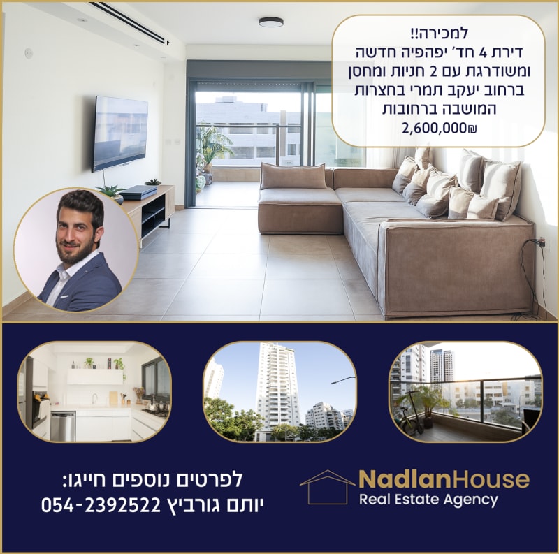 חדש למכירה ברחובות – דירת 4 חדרים מרווחת במיקום מעולה! 📍 רח' יעקב תמרי בשכונת חצרות המושבה 🏡 🛏️ 4 חדרים | 🏢 קומה 3 | 📐 95 מ"ר דירה מוארת ומרווחת בבניין חדש, בפרויקט המבוקש של גינדי בשכונה חצרות המושבה ברחובות 🏡 ✅ כיוון דרום-מערב, מוארת מאוד ונעימה 🌞 ✅ מזגן מיני מרכזי ✅ מטבח איכותי ומשודרג ✅ חדר הורים עם שירותים ומקלחת ✅ מרפסת 12 מ"ר מקורה עם נק' מים וגז (כולל מנגל בחוץ) ✅ מחסן פרטי ✅ 2 חניות (צמודות!) בטאבו ✅ ממ"ד ✅ 3 מעליות (אחת מהן מעלית שבת) ✅ פיר אשפה קומתי ✅ לובי מעוצב ויוקרתי, מועדון דיירים מפנק, חדר עגלות ואופניים ועוד.. ✅ פארק ענק ומושקע בלב השכונה 🏡 שכונה איכותית עם פארקים, מוסדות חינוך, מרכזי קניות ונגישות מצוינת לכל חלקי העיר וליציאה מהעיר! 💼 הדירה מושכרת לשוכרים מעולים שמעוניינים להמשיך, כך שתוכלו להיכנס ולהרוויח מהיום הראשון! 📅 פינוי גמיש מחיר: 2,530,000₪ 📞 לפרטים נוספים ותיאום ביקור – צרו קשר! יותם גורביץ'- 054-2392522 | רישיון תיווך מספר 3145358 | וואטסאפ: https://katzr.net/38c40c Nadlan House - שיווק פרויקטים למגורים, תיווך נדל''ן ונכסי יוקרה