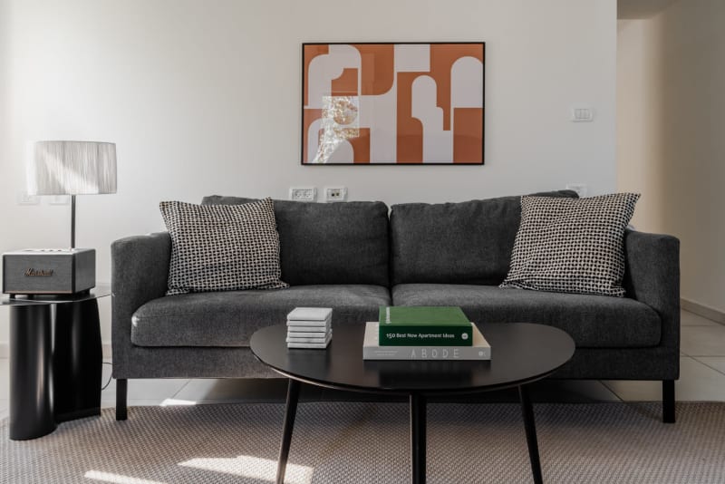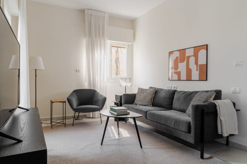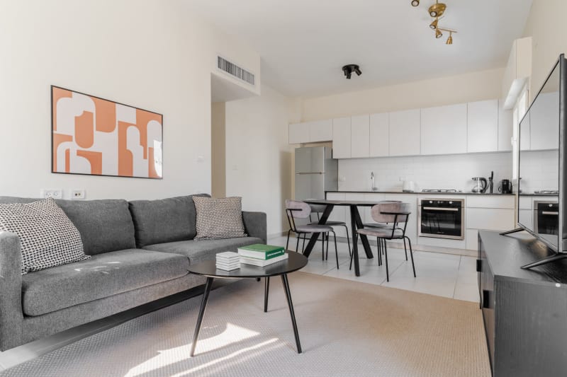 Discover the best of Tel Aviv, with this one bedroom apartment in Nachalat Binyamin with balcony views over the city. It’ll be easy to simply show up and start living in this airy furnished apartment with its fully equipped kitchen, lovely living room, and our dedicated, on-the-ground support. (ID #TLV9) Rates vary depending on the duration of stay, season, and other parameters. For exact pricing and additional pricing components, please visit our website and enter your desired move-in and move-out dates. The rate is applicable when billed upfront; it can be higher if billed in multiple payments. Were you looking for an unfurnished lease? Try Blueground instead and upgrade from unfurnished to furnished living: Furnished at rates comparable to unfurnished No setup or furniture costs - save thousands Move-in ready - save time, just bring your suitcase Designed with you in mind Gorgeous furniture, fully equipped kitchen, smart TV, and a premium wireless speaker are just a few of the amenities you’ll find inside this one bedroom apartment. Ideally located in Tel Aviv, you’ll find a lot to love outside as well. When you’re ready to relax, you’ll be happy to discover every bedroom comes with superior quality mattresses. We handle everything so you can simply show up and start living. This apartment also offers in-apartment laundry. Sleeping arrangements Queen Bed, 63in/160cm Amenities Building amenities unique to this one bedroom apartment include an on-site: Dryer Elevator Washing machine Pets allowed Arrival and ongoing support Full Maintenance and Technical Support / cleaning requests at a click of a button. Other things to note Pets are welcome, though weight limits and breed restrictions apply and may incur fees. The displayed price excludes VAT. Israeli citizens must add 18% VAT, which also applies to reservations without verified tourist status (B2/B3/B4 voucher).