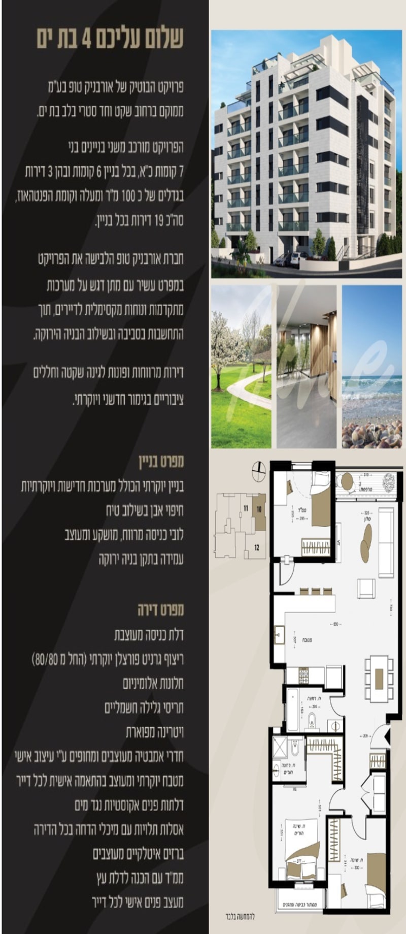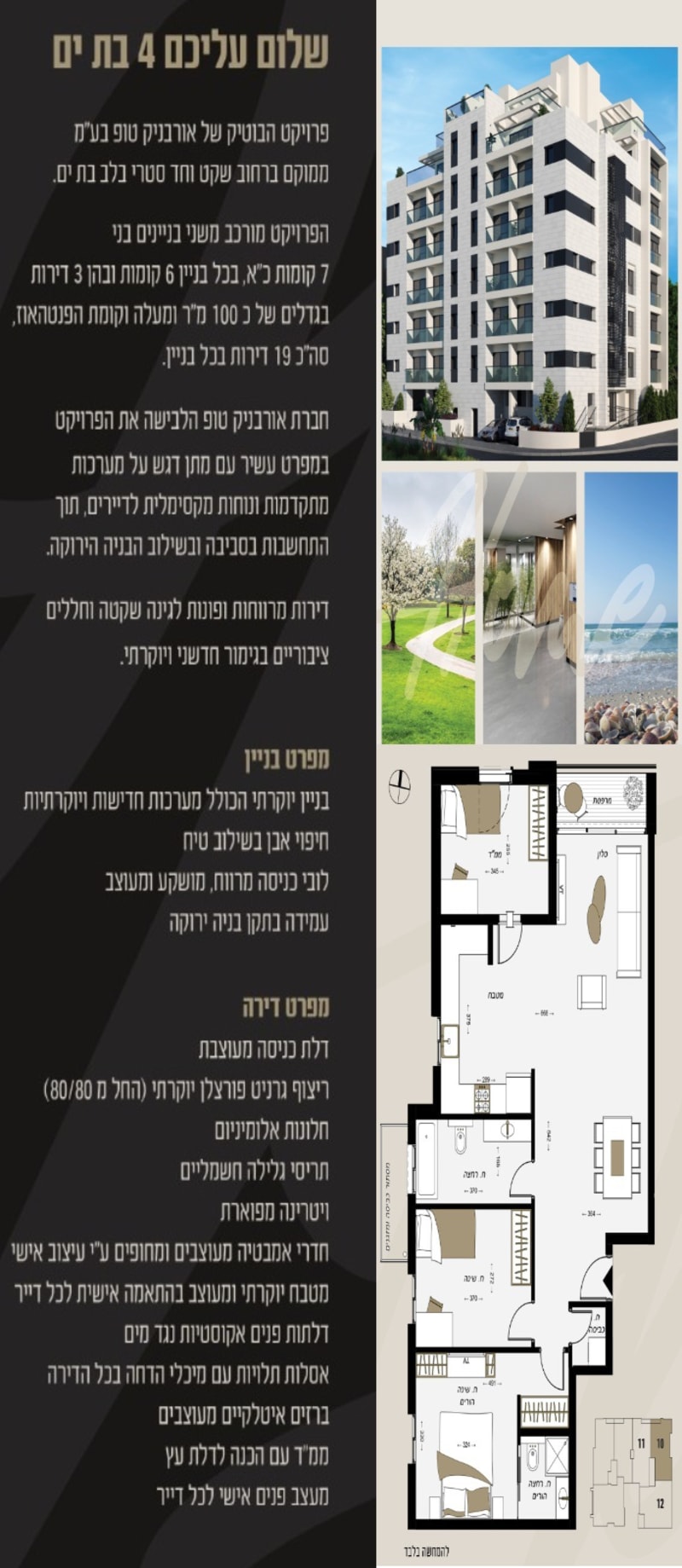 למכירה במיקום הכי מרכזי ומבוקש בבת ים בלב העיר!!!!!! מגוון דירות דירות 4 חד' בגדלים שונים מ-90 - 111 מ"ר ועוד. דירות חדשות מהקבלן משודרגות בסטנדרט גבוה עם מפרט עשיר!!!! הדירה ממוקמת בסמוך לרכבת הקלה, תחבורה ציבורית רחוב ראשי מונגש והליכה קצרה לים.