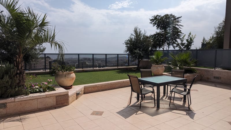 דירת חלומות למכירה - בירושלים , ארנונה - רחוב ים המלח . ראיתם פעם דירה בירושלים עם נוף לים ? אז הנה יש - עובדה !!! דופלקס מיוחד ומעוצב, 5 חדרים 156 מ'ר ,כניסה פרטית, 3 מ' גובה קומה נטו, חצר היקפית ענקית כ- 200 מ"ר חלקה מרוצפת - חלקה מגוננת ומטופחת , גג פרטי 78 מ'ר. 3 כיווני אוויר ,זיגוג כפול , חלונות אלומיניום -דריי קיפ , תריסי אלומיניום חשמליים ,סורגים, מרוצף בשיש מיצרי וגרניט פורצלן , 2 ושני חצי חדרי רחצה, גג פרטי - ספא -סאונה - ג'קוזי, 2 מערכות מיזוג אוויר,חימום תת רצפתי, שואב אבק מרכזי, מטבח רגבה מושקע במיוחד, מוארת ואוורירית ,נוף מדהים. חניות ומחסן . Best Location in Arnona Jerusalem , really nice 4BR 2 and 2 half BA TV Room, town home 156 sqm. on nice quiet one-way street with a private roof-top patio 78 sqm. Open living area, dining room, living room and a family room on the first level. Impact glass sliding doors leading to a beautiful private Yard/Balcony area surrounding the property 200 sqm. private entrance from street/garage. Gorgeous luxury "Regba" designers kitchen. 2 private parking spots under the property in the building's covered parking. roof-top patio 78sqm. include a dry sauna and a 6 people Jacuzzi. Central Air Conditioner, Under-Floor Heating, Central Vacuum Cleaner, Egyptian Granite Marble Floors.Best View - Dead Sea .
