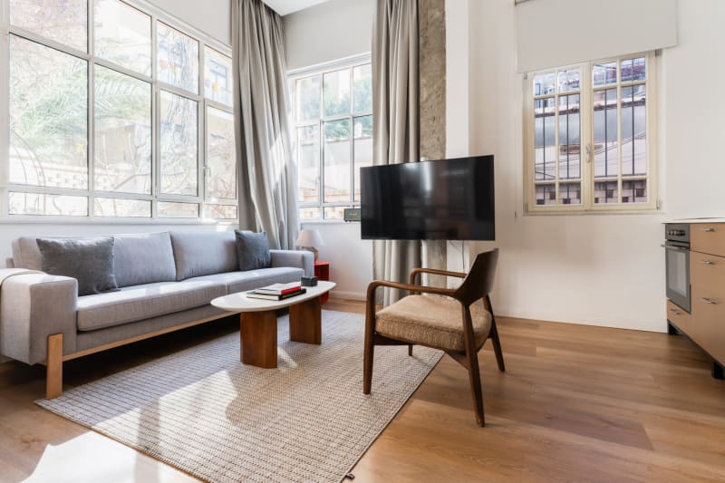 You’ll love this beautiful Nachalat Binyamin furnished one bedroom apartment with its modern decor, fully equipped kitchen, and spacious living room . Ideally located, you’re close to all the best that Tel Aviv has to offer! (ID #TLV51) Rates vary depending on the duration of stay, season, and other parameters. For exact pricing and additional pricing components, please visit our website and enter your desired move-in and move-out dates. The rate is applicable when billed upfront; it can be higher if billed in multiple payments. Were you looking for an unfurnished lease? Try Blueground instead and upgrade from unfurnished to furnished living: Furnished at rates comparable to unfurnished No setup or furniture costs - save thousands Move-in ready - save time, just bring your suitcase Designed with you in mind Gorgeous furniture, fully equipped kitchen, smart TV, and a premium wireless speaker are just a few of the amenities you’ll find inside this one bedroom apartment. Ideally located in Tel Aviv, you’ll find a lot to love outside as well. When you’re ready to relax, you’ll be happy to discover every bedroom comes with superior quality mattresses. We handle everything so you can simply show up and start living. This apartment also offers in-apartment laundry. Sleeping arrangements Queen Bed, 63in/160cm Amenities Building amenities unique to this one bedroom apartment include an on-site: Dryer Washing machine Arrival and ongoing support Full Maintenance and Technical Support / cleaning requests at a click of a button. Other things to note This apartment has flexible lease options, allowing you to book it for one month, a year, or more. This apartment can be booked for short term stays, with the option to extend to one month or longer. Please keep in mind that this is a walk up building. The displayed price excludes VAT. Israeli citizens must add 18% VAT, which also applies to reservations without verified tourist status (B2/B3/B4 voucher).