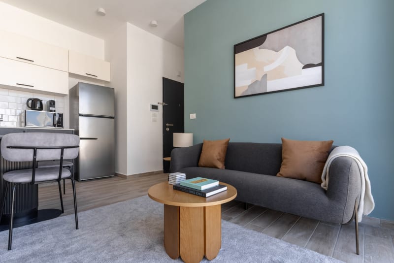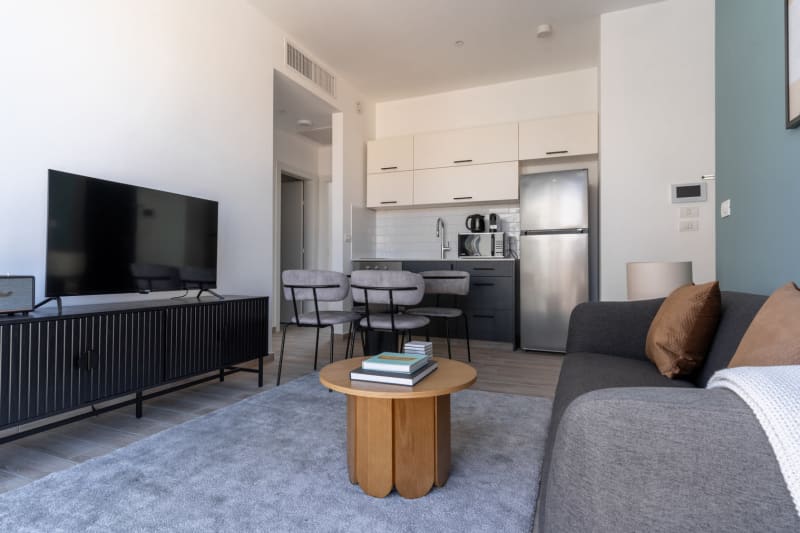 Discover the best of Tel Aviv, with this two bedroom apartment in Tel Aviv with balcony views over the city. It’ll be easy to simply show up and start living in this modernly furnished apartment with its fully equipped kitchen, stylish living room, and our dedicated, on-the-ground support. (ID #TLV19) Rates vary depending on the duration of stay, season, and other parameters. For exact pricing and additional pricing components, please visit our website and enter your desired move-in and move-out dates. The rate is applicable when billed upfront; it can be higher if billed in multiple payments. Were you looking for an unfurnished lease? Try Blueground instead and upgrade from unfurnished to furnished living: Furnished at rates comparable to unfurnished No setup or furniture costs - save thousands Move-in ready - save time, just bring your suitcase Designed with you in mind Thoughtfully designed with bespoke finishes, modern furnishings, and a fully equipped kitchen, you’ll enjoy that “I’m home” feeling with this apartment. Whether you’re lounging in your charming living room streaming the latest and greatest entertainment on the smart TV or premium wireless speaker, or getting some well-earned rest on the superior quality mattress with luxury linens, you’ll fall in love with everything this Tel Aviv apartment has to offer. Sleeping arrangements Queen Bed, 63in/160cm Queen Bed, 63in/160cm Amenities Building amenities unique to this two bedroom apartment include an on-site: Dryer in building Elevator Washing machine in building Pets allowed Arrival and ongoing support Full Maintenance and Technical Support / cleaning requests at a click of a button. Other things to note Pets are welcome, though weight limits and breed restrictions apply and may incur fees. The displayed price excludes VAT. Israeli citizens must add 18% VAT, which also applies to reservations without verified tourist status (B2/B3/B4 voucher).