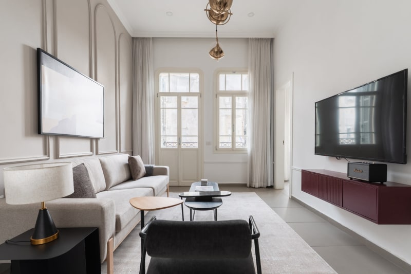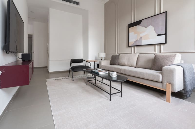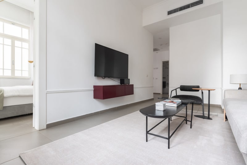 You’ll love this cozy Nachalat Binyamin furnished two bedroom apartment with its modern decor, fully equipped kitchen, and roomy living room with great balcony views. Ideally located, you’re close to all the best that Tel Aviv has to offer! (ID #TLV54) Rates vary depending on the duration of stay, season, and other parameters. For exact pricing and additional pricing components, please visit our website and enter your desired move-in and move-out dates. The rate is applicable when billed upfront; it can be higher if billed in multiple payments. Were you looking for an unfurnished lease? Try Blueground instead and upgrade from unfurnished to furnished living: Furnished at rates comparable to unfurnished No setup or furniture costs - save thousands Move-in ready - save time, just bring your suitcase Designed with you in mind In this apartment, you’ll find a thoughtfully designed space complete with beautiful furniture and a fully equipped kitchen in this two bedroom property. And, thanks to our superior quality mattresses, luxury linens, and towels, you can relax knowing you’ll always feel comfortably at home. When you’re ready for some fun, you can take in the Tel Aviv vibes or bring the entertainment to you with the premium wireless speaker or smart TV. Sleeping arrangements Queen Bed, 63in/160cm Queen Bed, 63in/160cm Amenities Building amenities unique to this two bedroom apartment include an on-site: Washing machine Rooftop Arrival and ongoing support Full Maintenance and Technical Support / cleaning requests at a click of a button. Other things to note This apartment has flexible lease options, allowing you to book it for one month, a year, or more. This apartment can be booked for short term stays, with the option to extend to one month or longer. Please keep in mind that this is a walk up building. The displayed price excludes VAT. Israeli citizens must add 18% VAT, which also applies to reservations without verified tourist status (B2/B3/B4 voucher).