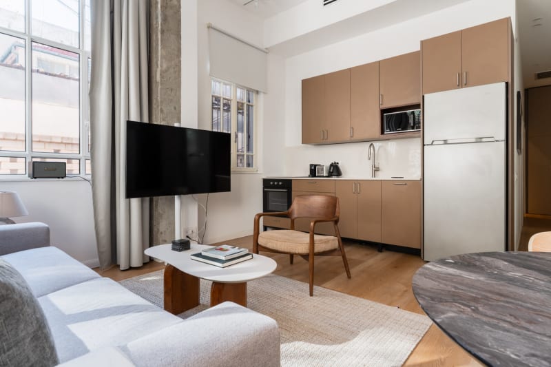 You’ll love this beautiful Nachalat Binyamin furnished one bedroom apartment with its modern decor, fully equipped kitchen, and spacious living room . Ideally located, you’re close to all the best that Tel Aviv has to offer! (ID #TLV51) Rates vary depending on the duration of stay, season, and other parameters. For exact pricing and additional pricing components, please visit our website and enter your desired move-in and move-out dates. The rate is applicable when billed upfront; it can be higher if billed in multiple payments. Were you looking for an unfurnished lease? Try Blueground instead and upgrade from unfurnished to furnished living: Furnished at rates comparable to unfurnished No setup or furniture costs - save thousands Move-in ready - save time, just bring your suitcase Designed with you in mind Gorgeous furniture, fully equipped kitchen, smart TV, and a premium wireless speaker are just a few of the amenities you’ll find inside this one bedroom apartment. Ideally located in Tel Aviv, you’ll find a lot to love outside as well. When you’re ready to relax, you’ll be happy to discover every bedroom comes with superior quality mattresses. We handle everything so you can simply show up and start living. This apartment also offers in-apartment laundry. Sleeping arrangements Queen Bed, 63in/160cm Amenities Building amenities unique to this one bedroom apartment include an on-site: Dryer Washing machine Arrival and ongoing support Full Maintenance and Technical Support / cleaning requests at a click of a button. Other things to note This apartment has flexible lease options, allowing you to book it for one month, a year, or more. This apartment can be booked for short term stays, with the option to extend to one month or longer. Please keep in mind that this is a walk up building. The displayed price excludes VAT. Israeli citizens must add 18% VAT, which also applies to reservations without verified tourist status (B2/B3/B4 voucher).