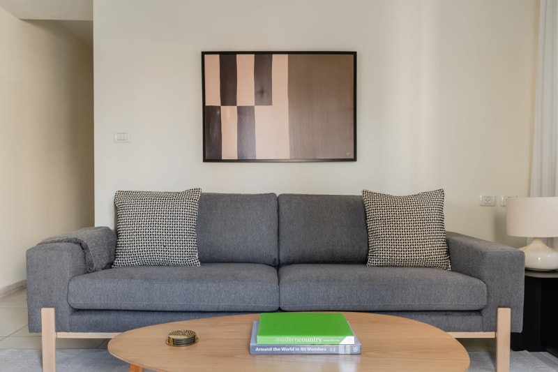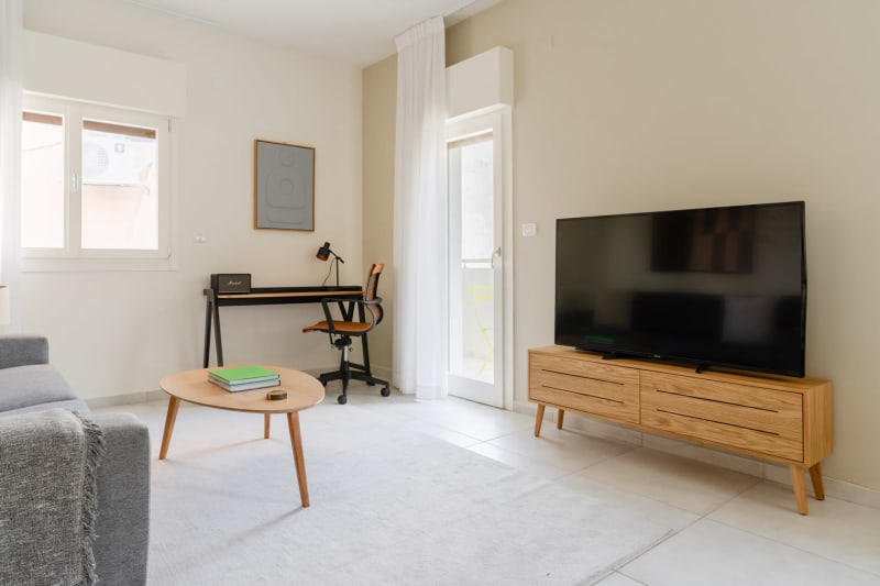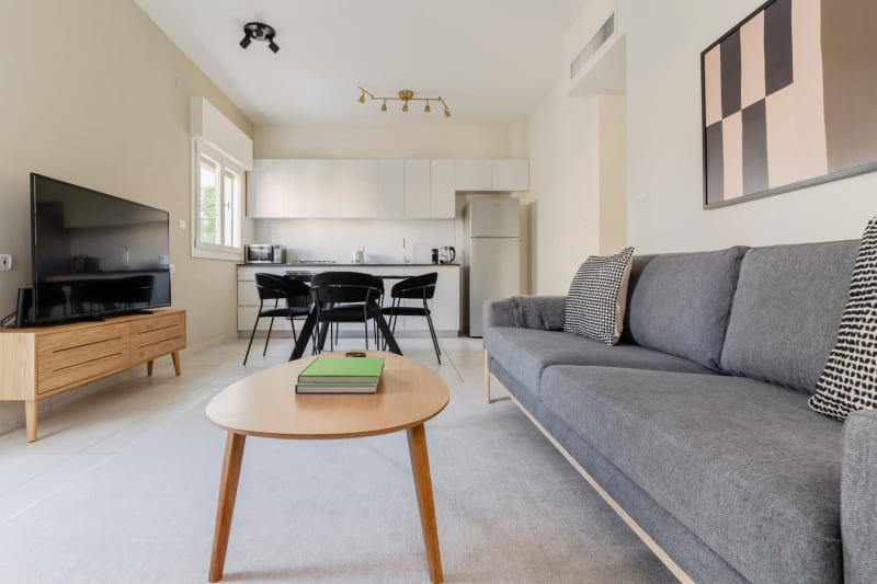 Rates vary depending on the duration of stay, season, and other parameters. For exact pricing and additional pricing components, please visit our website and enter your desired move-in and move-out dates. The rate is applicable when billed upfront; it can be higher if billed in multiple payments.(ID #TLV8) Discover the best of Tel Aviv, with this one bedroom apartment in Nachalat Binyamin with balcony views over the city. It’ll be easy to simply show up and start living in this contemporary furnished apartment with its fully equipped kitchen, sophisticated living room, and our dedicated, on-the-ground support. Were you looking for an unfurnished lease? Try Blueground instead and upgrade from unfurnished to furnished living: Furnished at rates comparable to unfurnished No setup or furniture costs - save thousands Move-in ready - save time, just bring your suitcase Designed with you in mind In this apartment, you’ll find a thoughtfully designed space complete with beautiful furniture and a fully equipped kitchen in this one bedroom property. And, thanks to our superior quality mattresses, luxury linens, and towels, you can relax knowing you’ll always feel comfortably at home. When you’re ready for some fun, you can take in the Tel Aviv vibes or bring the entertainment to you with the premium wireless speaker or smart TV. This apartment also offers in-apartment laundry. Sleeping arrangements Queen Bed, 63in/160cm Amenities Building amenities unique to this one bedroom apartment include an on-site: Dryer Elevator Washing machine Pets allowed Arrival and ongoing support Full Maintenance and Technical Support / cleaning requests at a click of a button. Other things to note This apartment has flexible lease options, allowing you to book it for one month, a year, or more. Pets are welcome, though weight limits and breed restrictions apply and may incur fees.