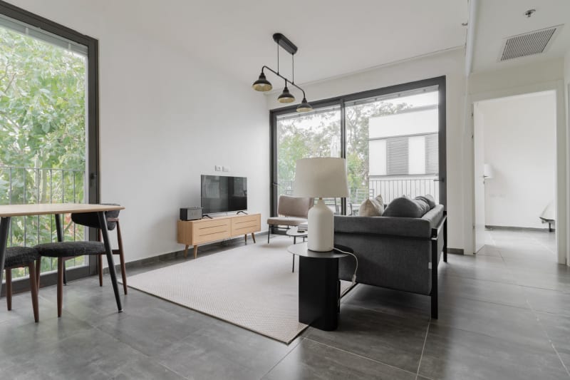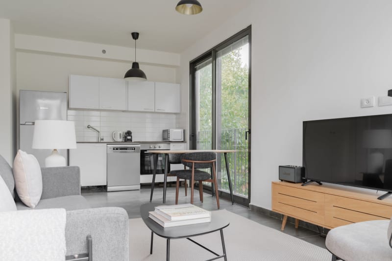 Show up and start living from day one in Tel Aviv with this stylish one bedroom Blueground apartment. You’ll love coming home to this thoughtfully furnished, beautifully designed, and fully equipped Lev HaIr home with stunning balcony views over the city. (ID #TLV23) Rates vary depending on the duration of stay, season, and other parameters. For exact pricing and additional pricing components, please visit our website and enter your desired move-in and move-out dates. The rate is applicable when billed upfront; it can be higher if billed in multiple payments. Were you looking for an unfurnished lease? Try Blueground instead and upgrade from unfurnished to furnished living: Furnished at rates comparable to unfurnished No setup or furniture costs - save thousands Move-in ready - save time, just bring your suitcase Designed with you in mind Thoughtfully designed with bespoke finishes, modern furnishings, and a fully equipped kitchen, you’ll enjoy that “I’m home” feeling with this Blueground apartment. Whether you’re lounging in your beautiful living room streaming the latest and greatest entertainment on the smart TV or premium wireless speaker, or getting some well-earned rest on the superior quality mattress with luxury linens, you’ll fall in love with everything this Lev HaIr apartment has to offer. Sleeping arrangements Queen Bed, 63in/160cm Amenities Building amenities unique to this one bedroom apartment include an on-site: Elevator Washing machine Pets allowed Arrival and ongoing support Full Maintenance and Technical Support / cleaning requests at a click of a button. Other things to note Pet fees may apply. The displayed price excludes VAT. Israeli citizens must add 18% VAT, which also applies to reservations without verified tourist status (B2/B3/B4 voucher).